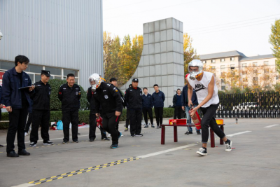 保衛(wèi)部微型消防站隊員需完成原地著消防防護(hù)服、佩戴自救呼吸器30米滅火、一人兩盤水帶連接操。原地著防護(hù)服,隊員在聽到“開始”口令后迅速穿戴防護(hù)服、消防靴、消防頭盔、扎安全腰帶。佩戴自救呼吸器,在起點處完成空氣呼吸器的佩戴,隨即提起4kg干粉滅火器快速到達(dá)距離30米處的指定區(qū)域進(jìn)行滅火。一人兩盤水帶連接操,隊員迅速甩開***盤水帶,一端接到消火栓接口,另一端接到第二盤水帶,在行進(jìn)中接上水槍到達(dá)終點,完成比賽。